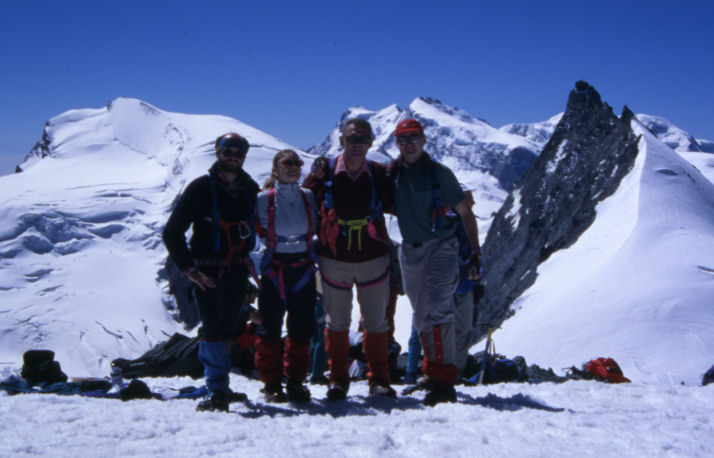 Auf dem Allalinhorn. Im Hintergrund das Strahlhorn und das Monte Rosamassiv.